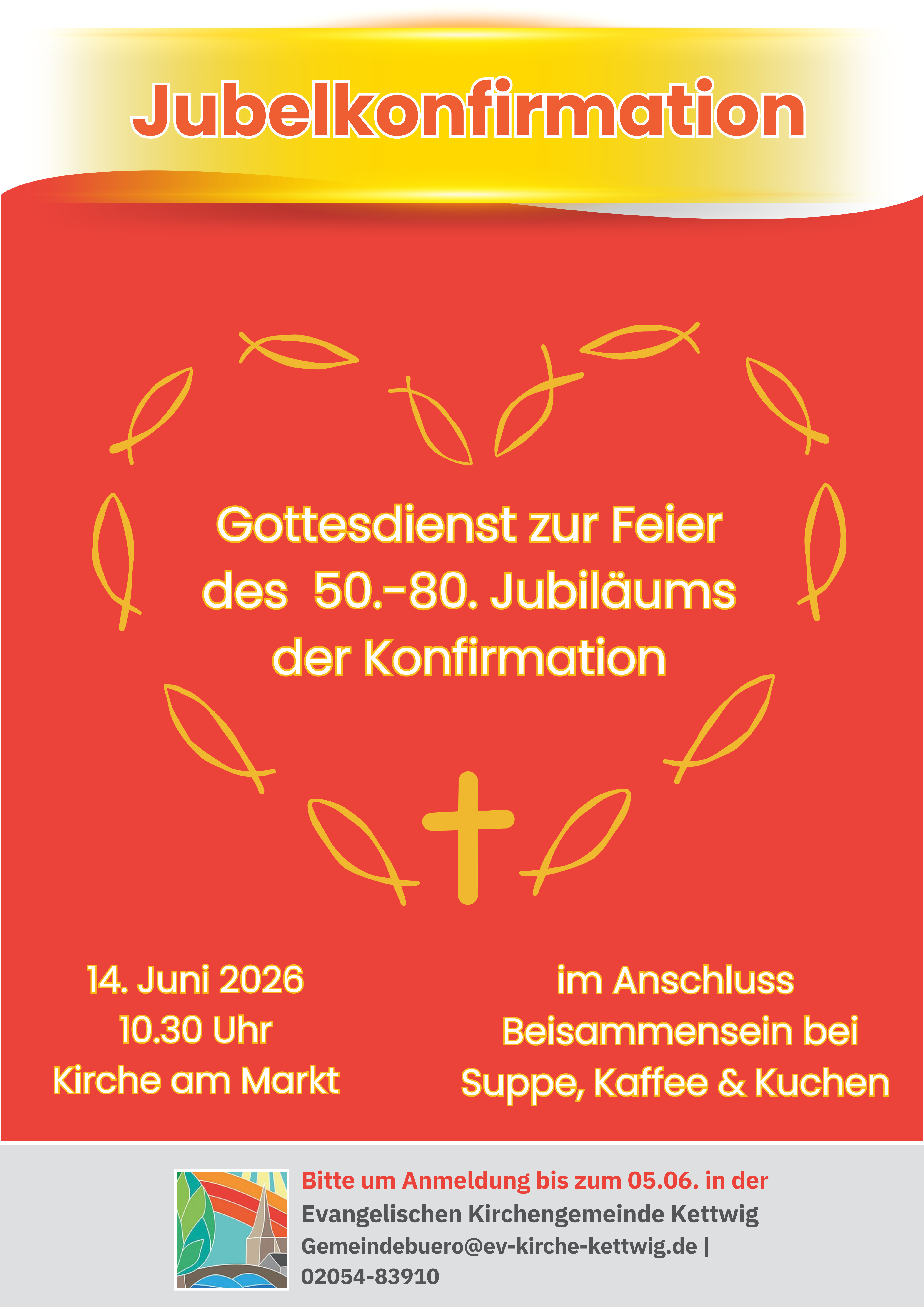Einmal im Jahr feiern wir die Jubelkonfirmation. Rechnen Sie mal nach: vielleicht sind auch Sie vor 50, 60 , 70 oder sogar 80 Jahren konfirmiert worden? Gleich, ob Ihre Konfirmation hier bei uns in Kettwig war oder anderswo: begehen Sie mit uns einen festlichen Tag zur Erinnerung dieses besonderen Ereignis!